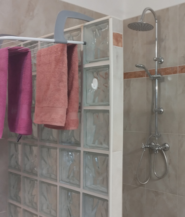 Zuhanyzós fürdőszoba + WC, külön bejáratú WC kézmosóval az emeleten.